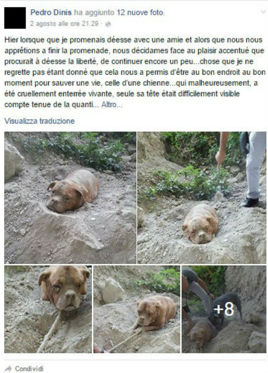 Una storia di dolore e sofferenza quella accaduta nei pressi di Carrieres-sur-Seine, in piena periferia di Parigi, portata alla luce dalla scoperta casuale fatta da un passante. Pedro Dinis stava passeggiando con il suo cane sulle stradine sterrate nei pressi della sua abitazione, quando si è imbattuto in una scoperta dolorosa: quella di un cane anziano sepolto e solo con la testa fuori dal terriccio. Anche il guinzaglio era stato nascosto sotto un cumulo di terreno e pietre, così da impedirgli la fuga. Eventualità che sarebbe stata comunque impossibile vista l’età avanzata e gli svariati problemi di salute: il cane femmina, di razza Dogue de Bordeaux, soffriva da tempo di artrite. La scelta del posto dove abbandonarla non è stata casuale, non essendo facilmente accessibile e di usuale passaggio.