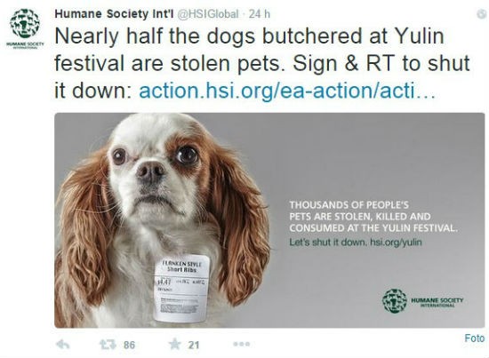 Peter Li della HSI ha osservato il tutto da vicino senza farsi scoprire, così da documentare la pratica ancora in atto. Testimone nei centri di macellazione ha potuto constatare un numero elevato di animali in attesa di finire sulle tavole dei commensali. Molti di questi ancora con il collarino, quindi esemplari di proprietà rubati da case e famiglie. Durante il suo passaggio è riuscito a trarre in salvo solo due cani e due gatti, se avesse chiesto l’intero gruppo non avrebbe potuto salvarne nemmeno uno. Secondo l’opinione dell’associazione, il commercio e la vendita della carne di cane è una tradizione che investe molte località cinesi e asiatiche, ma è possibile notare una controtendenza nelle nuove generazioni che osteggiano questa pratica favorendo la chiusura di molti macelli. La HSI ha lanciato una petizione per la chiusura del festival, ma sono molte le associazioni che da tutto il mondo lanciano l’allarme pronte a boicottare il festival stesso.
