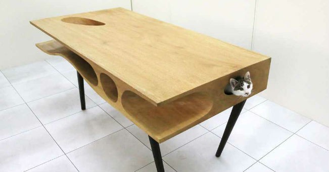 I fori creati nel tavolo sono del formato idoneo alla struttura fisica del gatto, oltre che tentazioni irresistibili. È un tavolo per noi, un paradiso per i gatti.