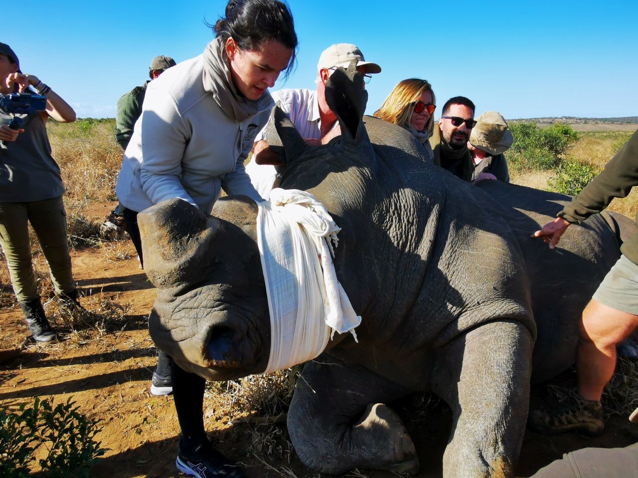 La caccia dei bracconieri è così sanguinaria (oltre 7.100 esemplari sono stati uccisi in Sudafrica in dieci anni, spesso lasciati morire sfigurati e dissanguati) che una delle strategie per proteggere questi affascinanti ungulati, oltre al complicato trasferimento in Botswana dove il contesto naturalistico della singolare pianura alluvionale del delta del fiume Okavango promette maggiore protezione, è quello di renderli inappetibili ai trafficanti segando periodicamente il corno, composto di cheratina, la stessa sostanza delle unghie, dei peli e dei capelli.