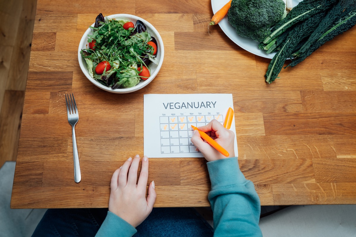 Veganesimo sostenibilità Veganuary - Top view woman filling veganuary calendar while eating fresh green salad sitting on kitchen. Fresh vegetables on the table. Vegan and vegetarian diet eating and cooking at home. Selective focus.