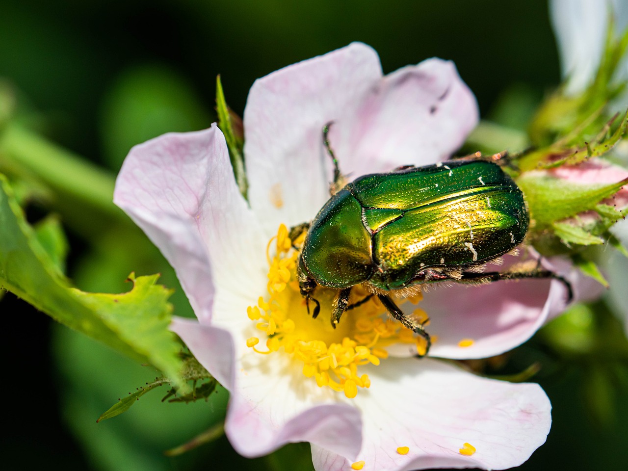 Durante la primavera, la cetonia aurata si nutre di corolle dei fiori, boccioli, frutta dolce e linfa. Mentre la sua alimentazione può influenzare le piante, non rappresenta una minaccia diretta per l’uomo.