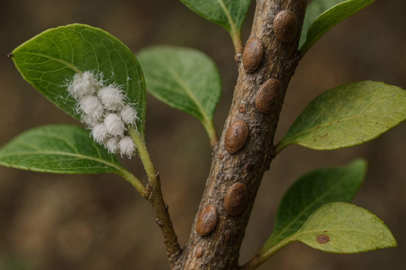 Si presentano come piccoli fiocchi bianchi, irregolari, simili a ovatta appoggiata sulla pianta. Le cocciniglie a scudetto, invece, si vedono più spesso su rametti, germogli e pagina superiore delle foglie: restano attaccate alla superficie, protette da uno scudo ceroso, e sembrano placchette tonde o ovali, dal giallo-bruno al grigio scuro.