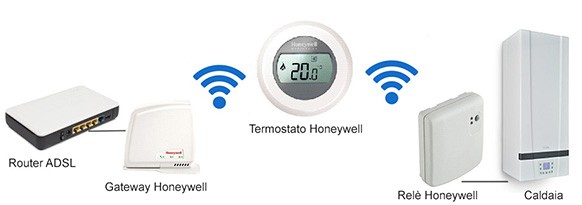 L’app installata su un dispositivo mobile si interfaccia dall’esterno con il gateway Honeywell collegato al router della propria connessione ADSL, il gateway comunica in modo wireless con il termostato che a sua volta gestisce la caldaia attraverso il relè.