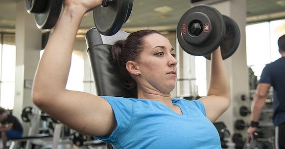 Sollevarsi fino alla posizione seduta per eseguire l’esercizio per i deltoidi successivo. Si comincia con i gomiti piegati a 90 gradi e le mani verso l’alto. Spingere i manubri verso l’alto avvicinado le braccia alle orecchie. Una volta distese tornare in posizione di partenza. Come per tutti gli esercizi, una lenta esecuzione provoca un lavoro maggiore per la muscolatura e quindi maggiori risultati.