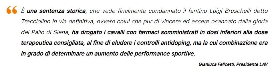 Se si va a leggere il comunicato diramato dalla LAV, ecco che il presidente della LAV, Gianluca Felicetti, parla di una “sentenza storica” per quanto riguarda la condanna del fantino L.B. Queste le sue parole in merito al fantino: “Colui che pur di vincere ed essere osannato dalla gloria del Palio di Siena, ha drogato i cavalli con farmaci somministrati in dosi inferiori alla dose terapeutica consigliata, al fine di eludere i controlli antidoping, ma la cui combinazione era in grado di determinare un aumento delle performance sportive”.
