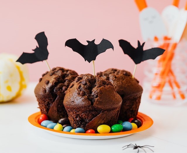 Potete creare dei pipistrelli di cartoncino da infilzare nei muffin o nei cupcake in maniera super veloce ed economica procurandovi del cartoncino nero, degli stuzzicadenti e della colla vinilica.