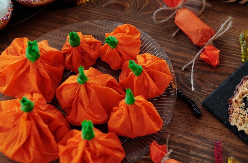 Iniziamo con le zucche di cartapesta, che potete ottenere ritagliando della carta pesta arancione in quadrati, nel posizionare al centro del cotone, o delle caramelle, se avete intenzione di regalarle ai bimbi che verranno a bussare alla vostra porta intonando la classica domanda “trick or treat?” e nel richiudere la carta creando una sorta di fagottino.