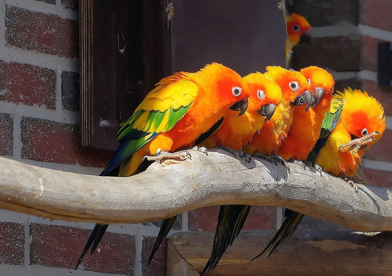 - Conuro del sole: originario del Sud America, dalla livrea giallo oro con piume verdi e blu, è un capace imitatore