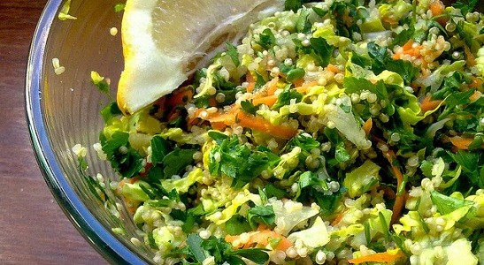 Vegan quinoa tabbouleh – Tabulé de quinoa di Lablascovegmenu Sciacquate la quinoa in un colino con dell’acqua fredda corrente. Nella pentola a pressione fate un soffritto di olio extravergine d’oliva e cipolla. Inseritevi dunque quinoa, acqua e sale, chiudete e cuocete per 10 minuti dal fischio (20 se la quinoa è rossa). Mettete dunque la pentola nel lavandino e fate scorrere un filo di acqua fredda direttamente sul coperchio della pentola. Preparate la quinoa condendo con olio, sale e pepe a piacere. Potete aggiungervi anche basilico, olive, capperi, prezzemolo, pomodorini, carotine, mais e fave.
