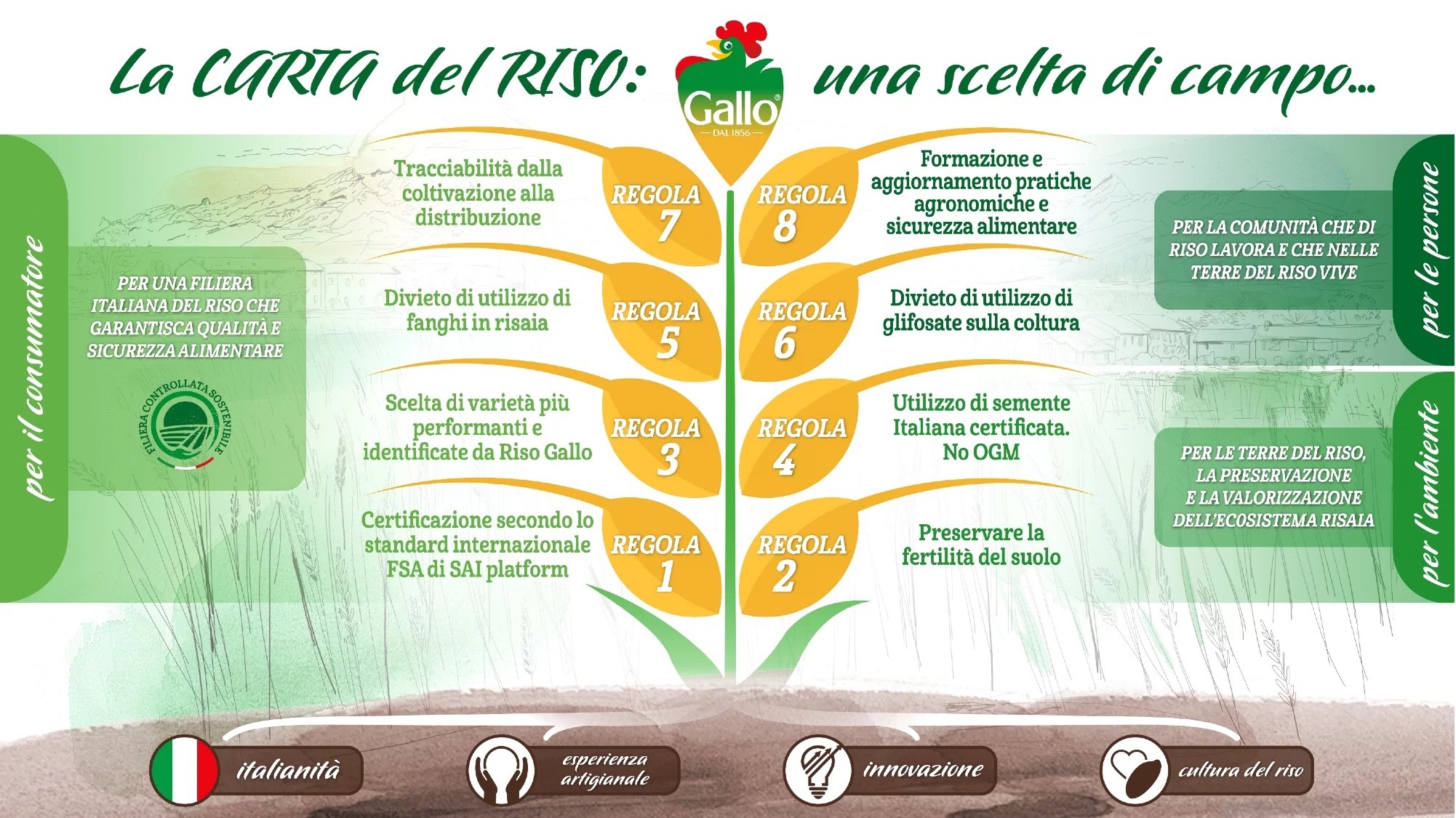 Riso Gallo è ben consapevole di quanto sia importante guardare al futuro e all’innovazione e per questo l’ottavo punto della “Carta del Riso Gallo”, “Formazione e aggiornamento pratiche agronomiche e sicurezza alimentare”, ha una rilevanza particolare. Riso Gallo è alla continua ricerca di nuovi strumenti per migliorare la biodiversità, ridurre l’inquinamento delle acque e per la razionalizzazione dei mezzi tecnici attraverso l’utilizzo di tecnologie satellitari, mettendo poi tali strumenti a disposizione delle aziende agricole con benefici per l’intero patrimonio ambientale, culturale e umano del nostro Paese. Inoltre, è consapevole che la sicurezza alimentare parte dal primo anello della catena di fornitura, ossia il campo dove viene coltivato il riso, nonché tutte le operazioni previste durante la sua coltivazione ed anche quelle successive alla raccolta come ad esempio lo stoccaggio presso le aziende agricole. Tutti fattori che si possono sommare contribuendo in modo positivo ad un prodotto sempre più sicuro che arriva sulle tavole degli italiani.