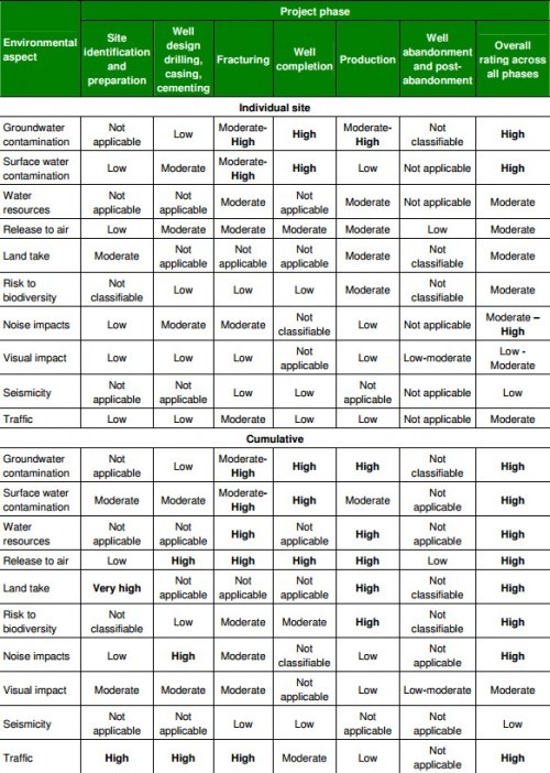 Da un punto di vista macroeconomico e politico, invece, è interessante l’analisi dell’ENEA italiana che mette in luce come puntare sul gas di scisto non fa altro che distogliere l’attenzione dalle rinnovabili. Analisi attendibile perché riporta i dati contenuti nello special report della IEA sul gas non convenzionale “Golden Rules for a Golden Age of Gas“. Ogni eventuale spinta verso lo shale gas, in ogni caso, dovrebbe essere ponderata dopo aver letto il rapporto dell’Unione europea sui suoi potenziali rischi. Nel quale è contenuta questa tabella che sintetizza perfettamente tutto ciò di cui abbiamo parlato fino a ora: